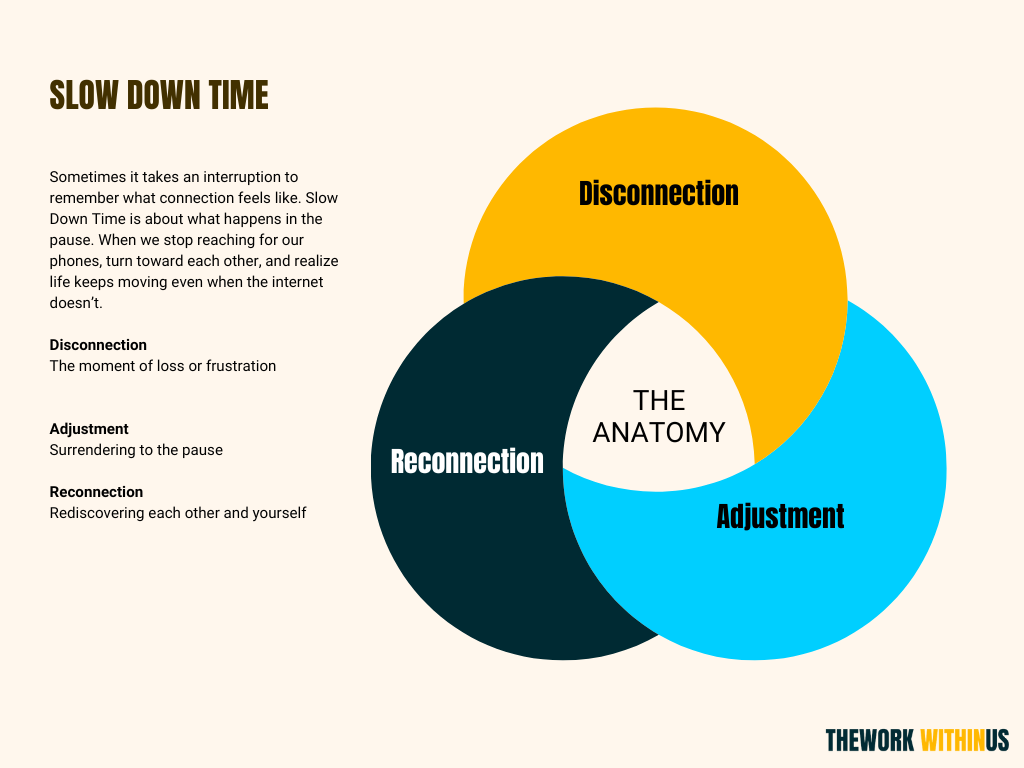 In a similar way, I don’t know if you’ve ever had your electricity go off. When your electricity goes off, there’s a certain amount of surrender. You’re frustrated for a little while, but then you’re just kind of like, “We’ll have to figure it out.” You get candles, you go eat out, you just figure it out. After you surrender to the fact that you don’t have electricity, your mind, your whole world shifts, and things slow down. You be differently in your house, you be differently with each other.