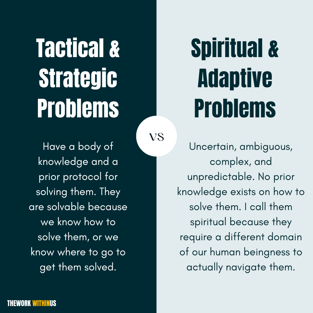 Adaptive/Spiritual Problems are uncertain, ambiguous, complex, and unpredictable. No prior knowledge exists on how to solve them. I call them spiritual because they require a different domain of our human beingness to actually navigate them.